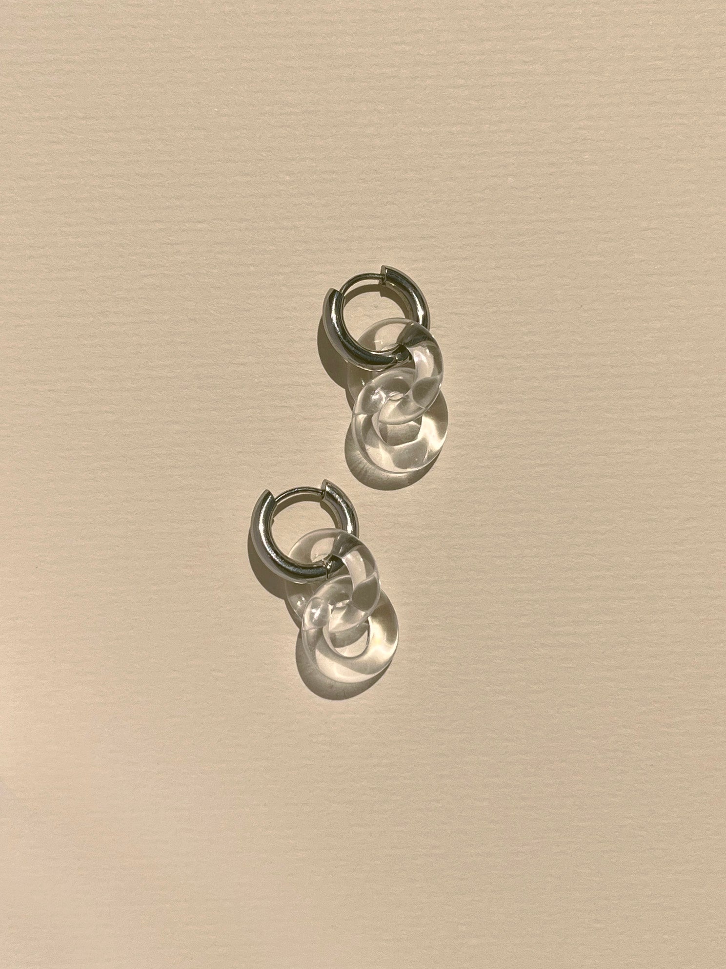 Two transparent borosilicate glass rings forever linked. Handmade in Barcelona from borosilicate glass using the lamp working technique, each piece is shaped by flame, one by one.