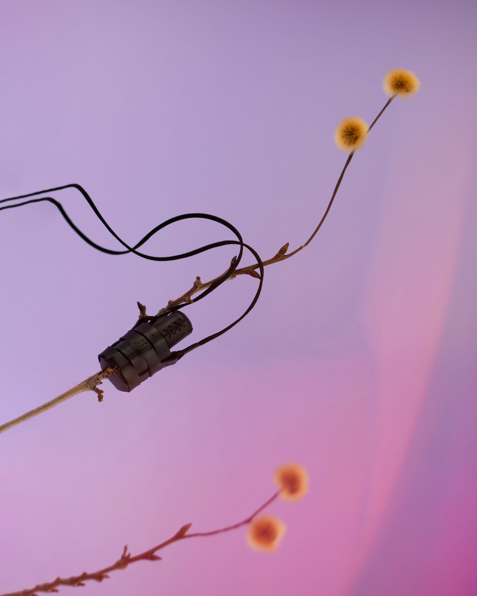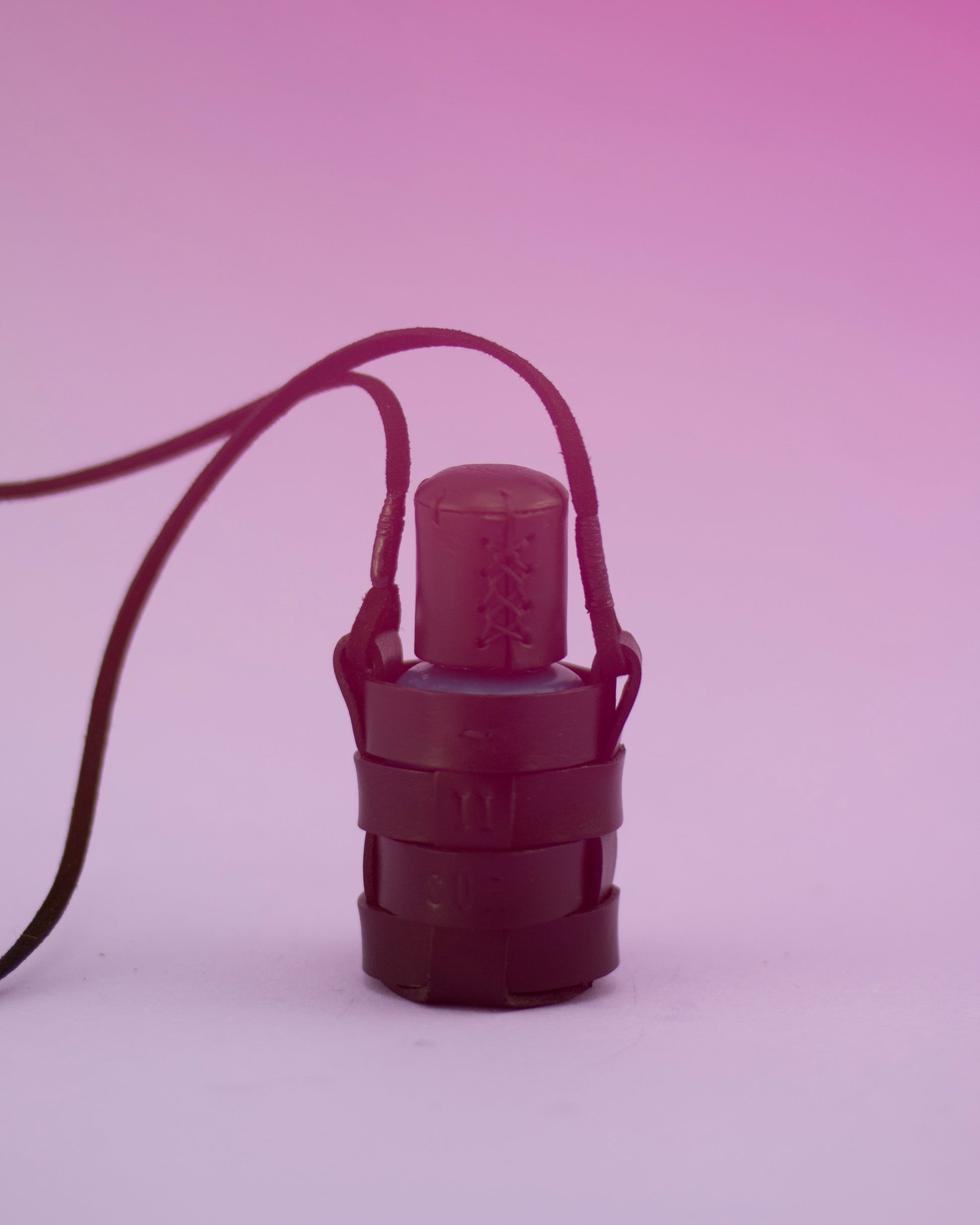 Oil perfume housed in black woven leather.